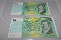 2 x 1985 $5 Australian Bank Notes - Signed Johnston & Fraser - Consecutive SN: PQT6996628...