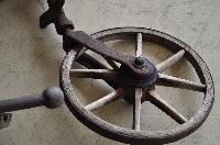 2 x Single Wheels, Old Pump, W.Pissell Portable Jack Stand, Metal Hitch & Wooden Box