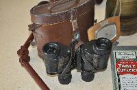 Group Lot of Assorted Items Including Westinghouse Fan, Sheffield Bone Handled Knives, Anodised Cup Set, Binoculars, Lamp & Vase