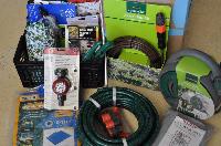 2 x Boxes of Assorted Garden Hoses, Weed Mats, Water Timers, Tarps, Sprinklers Etc